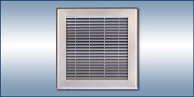 The grille is made of 14-gauge stainless steel with the outer perimeter formed to raise the grille face 7/16" from the wall or ceiling. The edge of the grille is manufactured with a beveled slope. No open or unfinished edges exist. The horizontal louvers are attached to a mating frame and ‘locked in’ to prevent movement or removal. The vertical mullions are correspondingly ‘locked in’ place creating a penetration proof neck and throat of 1-7/16" depth. Coupling nuts are attached to the back of the face flange for use with threaded rods. A mating duct collar with nuts receive the threaded rod and are tightened accordingly.